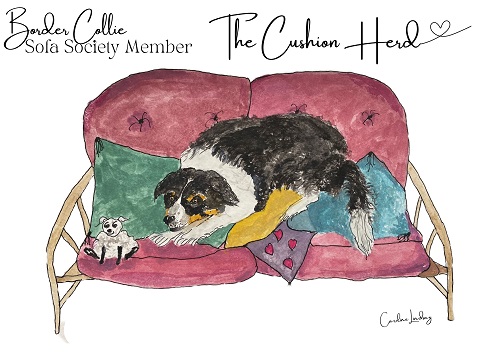 Border Collie Signed Print ‘The Cushion Herd’ Sofa Society Member (Black white gold)